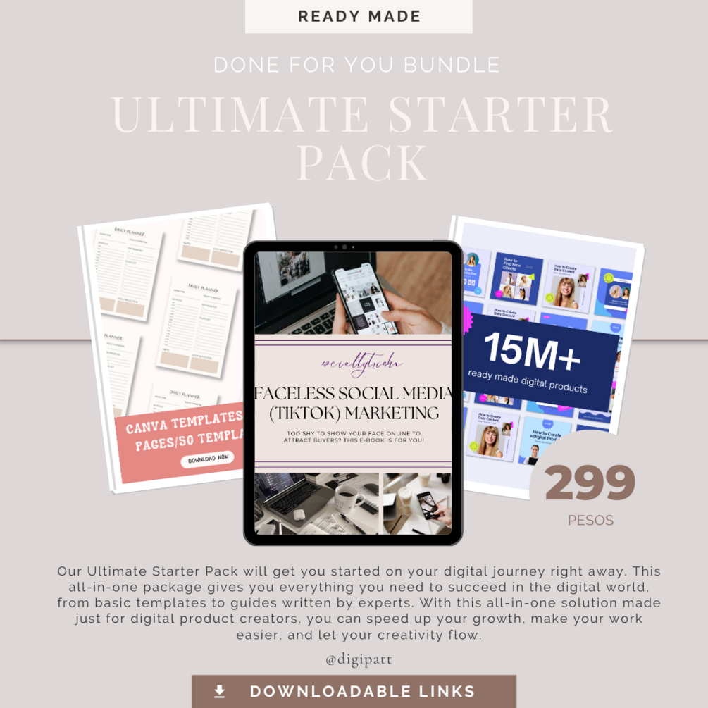 Our Ultimate Starter Pack will get you started on your digital journey right away. This all-in-one package gives you everything you need to succeed in the digital world, from basic templates to guides written by experts. With this all-in-one solution made just for digital product creators, you can speed up your growth, make your work easier, and let your creativity flow.